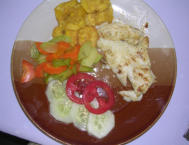 Bohnen. Dazu gibt es gebratene Kochbananen, Tomaten und ab uns zu